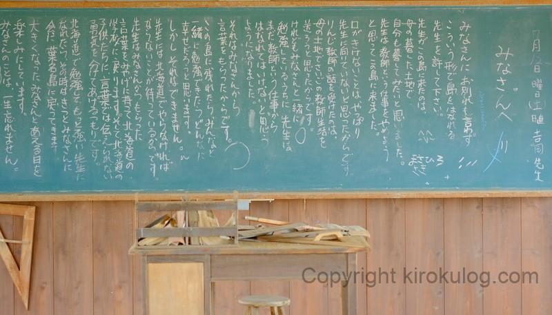 教室の黒板には、生徒たちに宛てた吉岡先生(機関車先生)のメッセージが書かれていました。