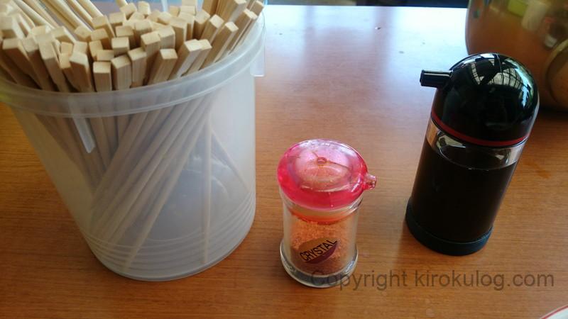注文すると、店員さんがだしをかけてくれますが、もっと味付けをしたい場合は、テーブル席にある醤油をかけてください。
