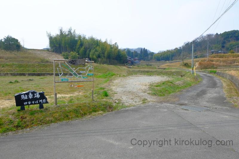空き地のほうの駐車場には、「駐車場 田舎そば川原」と書かれた看板が立っているので、すぐわかるかと思います。