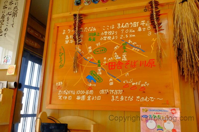 「田舎そば 川原」は、まんのう町立長炭小学校から、県道190号を綾川町方面に約2km進んだところにあります。