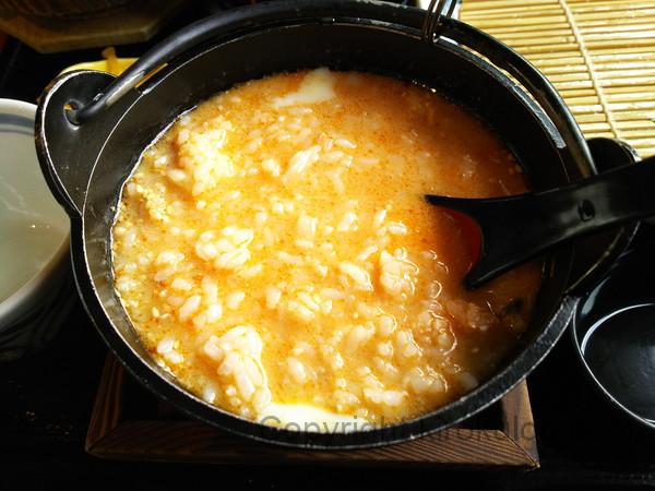 - うどんを食べ終わると、最後はごまだれダシにご飯を入れて雑炊のようにしていただきます