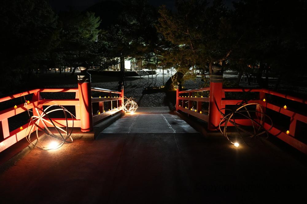 海のほうに続く赤い橋も、竹あかりでライトアップされています。
